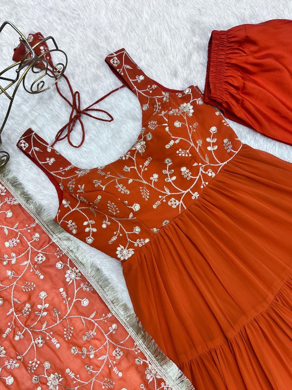SLEEVE FABRIC INSIDE ATTACHED, FANCY WORK BODY, PADDED, SIDE ZIPPER ,FIVE LAYER GATHERING BOTTOM CANVAS PATTA GOWN FLAIR: 12 mtr plus fully flair ANARKALI INNER: PURE MICRO SCRAPE FULL LINING