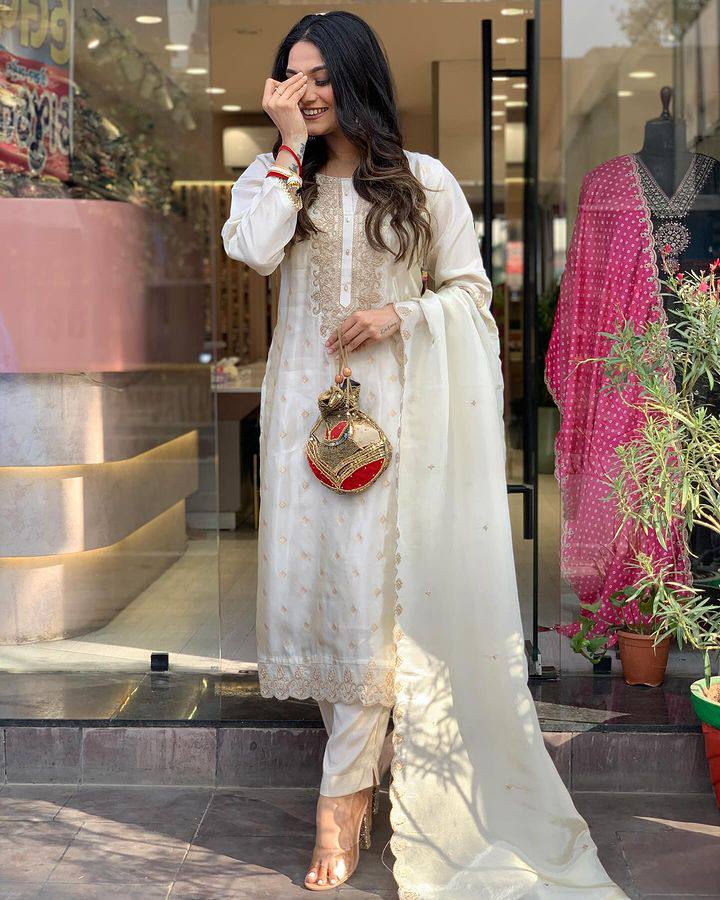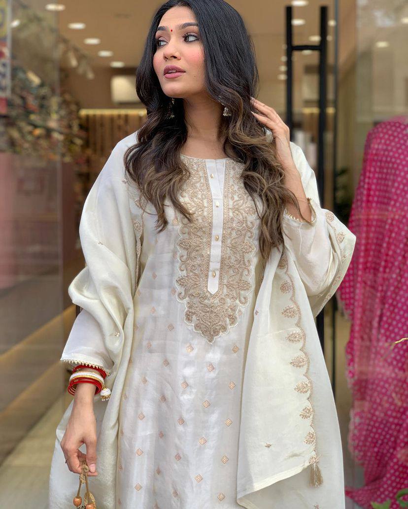 @ Kurti – Stitched @ @ Kurti Material: PURE Viscose Jacqard @ Kurti Length: 45 Inch @ Work: Embroidery @ Kurti Bust Size : Max Up To 44″ —————————————- @ Bottom – Stitched @ @ Bottom Fabric : Viscose Rayon @ Bottom Waist Size : Max up to 38″ @ Bottom Length : 37″ to 38″ —————————————- @ Dupatta -Stitched @ @ Dupatta Fabric : Chanderi @ Dupatta Length : 2.20 m